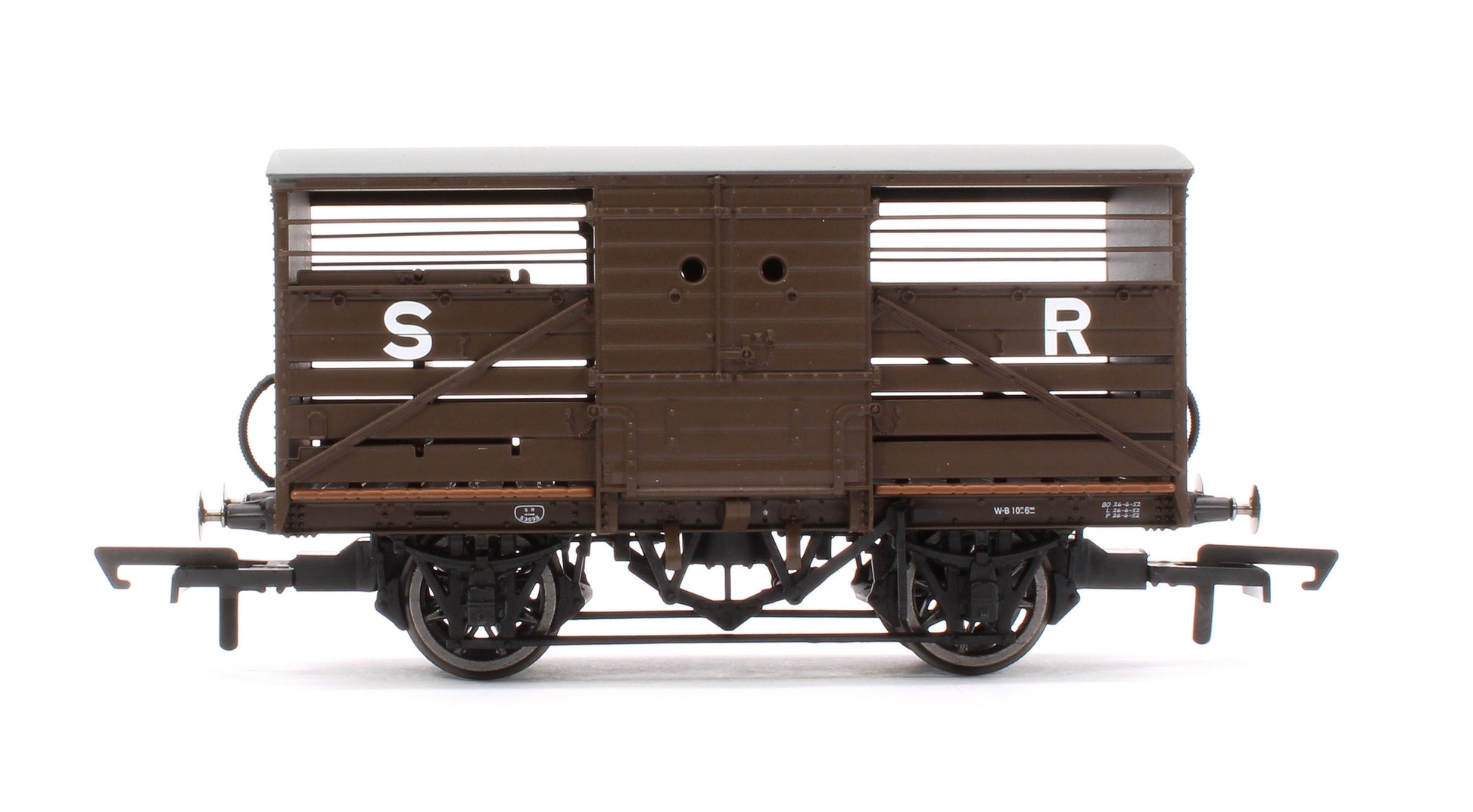 Cattle wagons were designed and produced to move livestock around the UK by rail and were very important for the agricultural economy. The livestock was carried from farm to farm, farm to ports, or farm to abattoirs. This model is based on a Southern Railway cattle van in dark brown with the famous SR letters printed on the side.