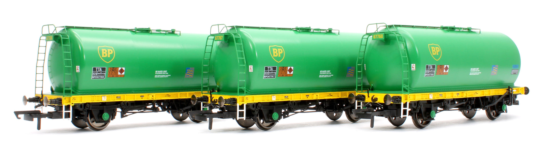 This triple pack of three TTA wagons are all decorated in detail carrying the eye-catching BP livery in green. Each wagon has a detailed gantry on the top with ladders, sprung buffers and different running numbers to create an accurate rake.