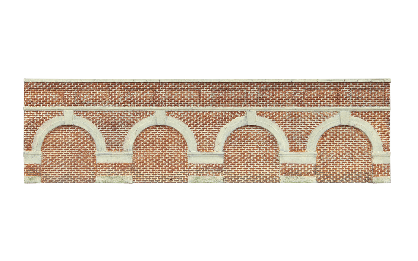 A pack of 2X scenic red brick Low Level Arched Retaining Walls as would be found lining an embankment or railway cutting.