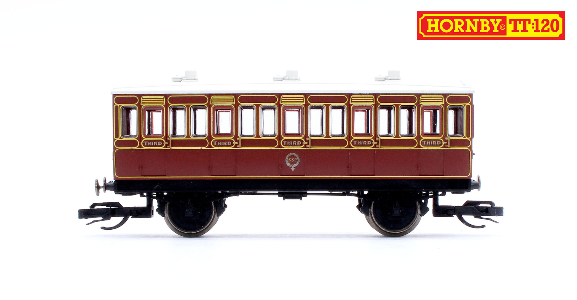 Hornby’s TT:120 LB&SCR Third Class Four-Wheel Coach is finished in the rich brown livery of the London, Brighton & South Coast Railway. This coach features the distinctive round LB&SCR crest with the coach number at its centre. A faithful representation of the everyday passenger stock that served bustling commuter routes and rural branch lines alike.