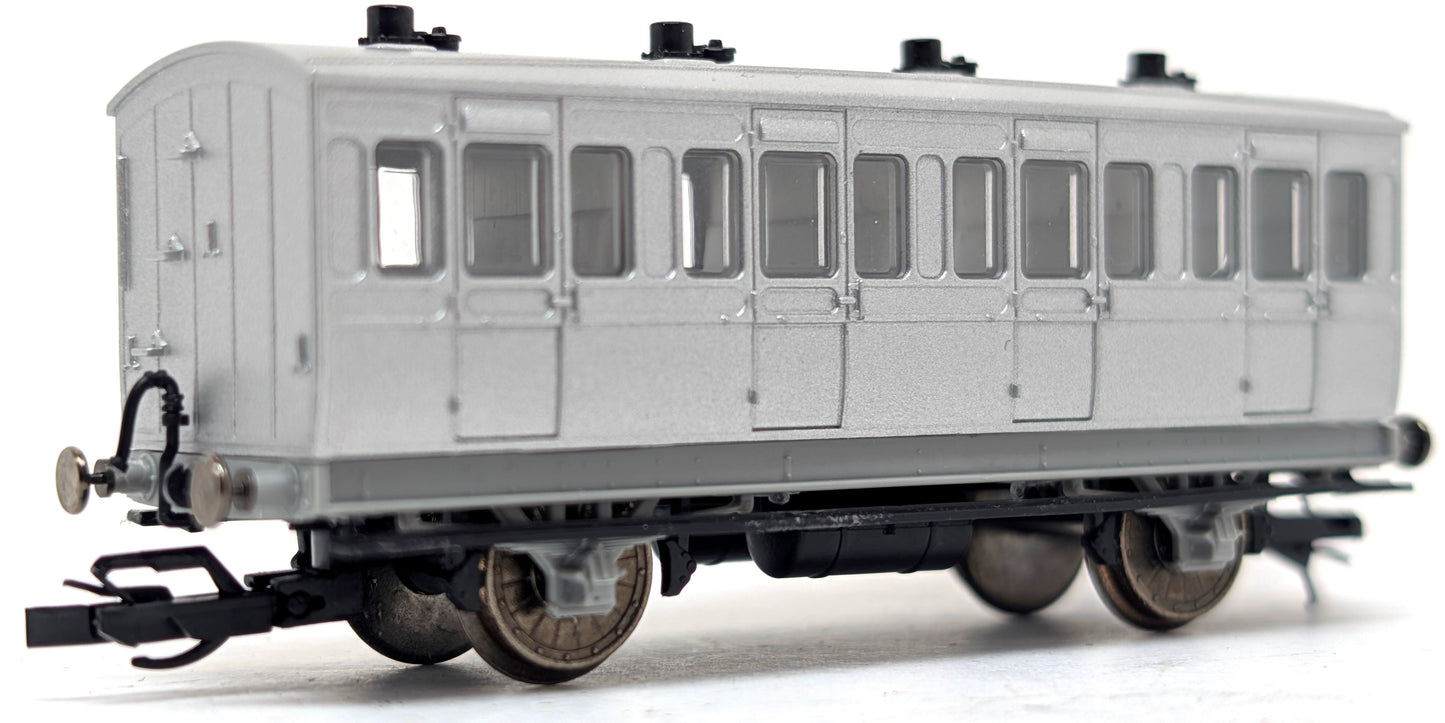 These four-wheel coaches are typical of the type that was operating at the end of the 19th century and into the early part of the 20th. Introduced by many of the pre-Grouping companies before the more comfortable bogie-coaches became common place. As new, more modern coaches were introduced, the four-wheelers were often cascaded down to rural branch lines and where passenger numbers were much lighter. Some survived into the 1950s and ‘60s, by virtue of their relative isolation from the major centres of operation, while others found further use as departmental vehicles. When these small vehicles were retired, often their bodies were bought-up by local people for use as summer homes, but especially by farmers who found they made good chicken coops or storage sheds. The chassis from the coaches often found further use as goods wagons. Because so many of these wooden bodies found their way into private hands, good number have survived to be saved by preservationists, who have refurbished them and mounted them onto suitable under-frames for use on heritage trains.