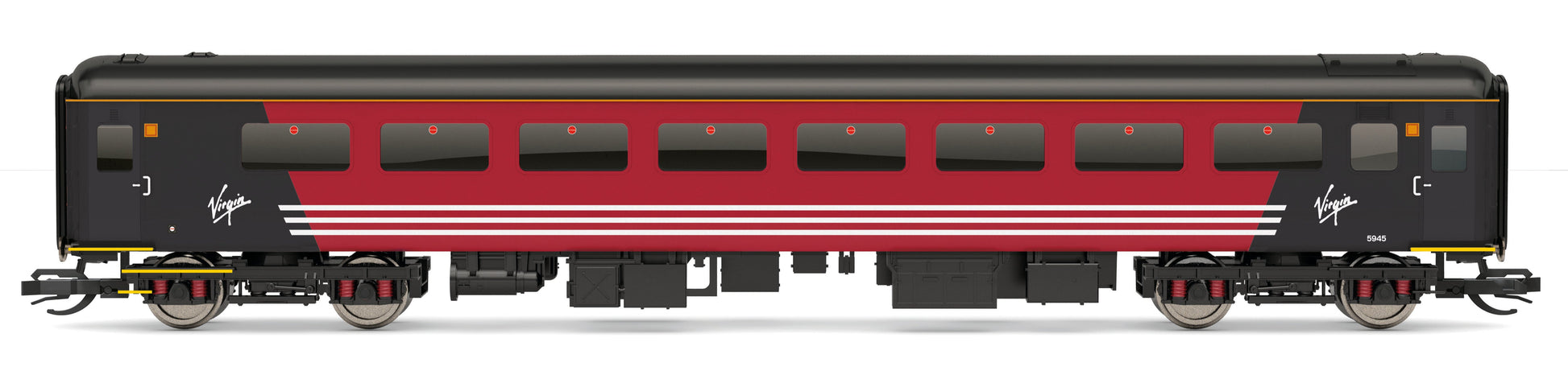 Finished in the iconic Virgin Trains red and black livery and featuring coach number ‘5945’, this striking coach pairs perfectly with our Virgin Mk2F coaches to form a realistic rake as seen on the West Coast services from the mid-1990s to early 2000s.