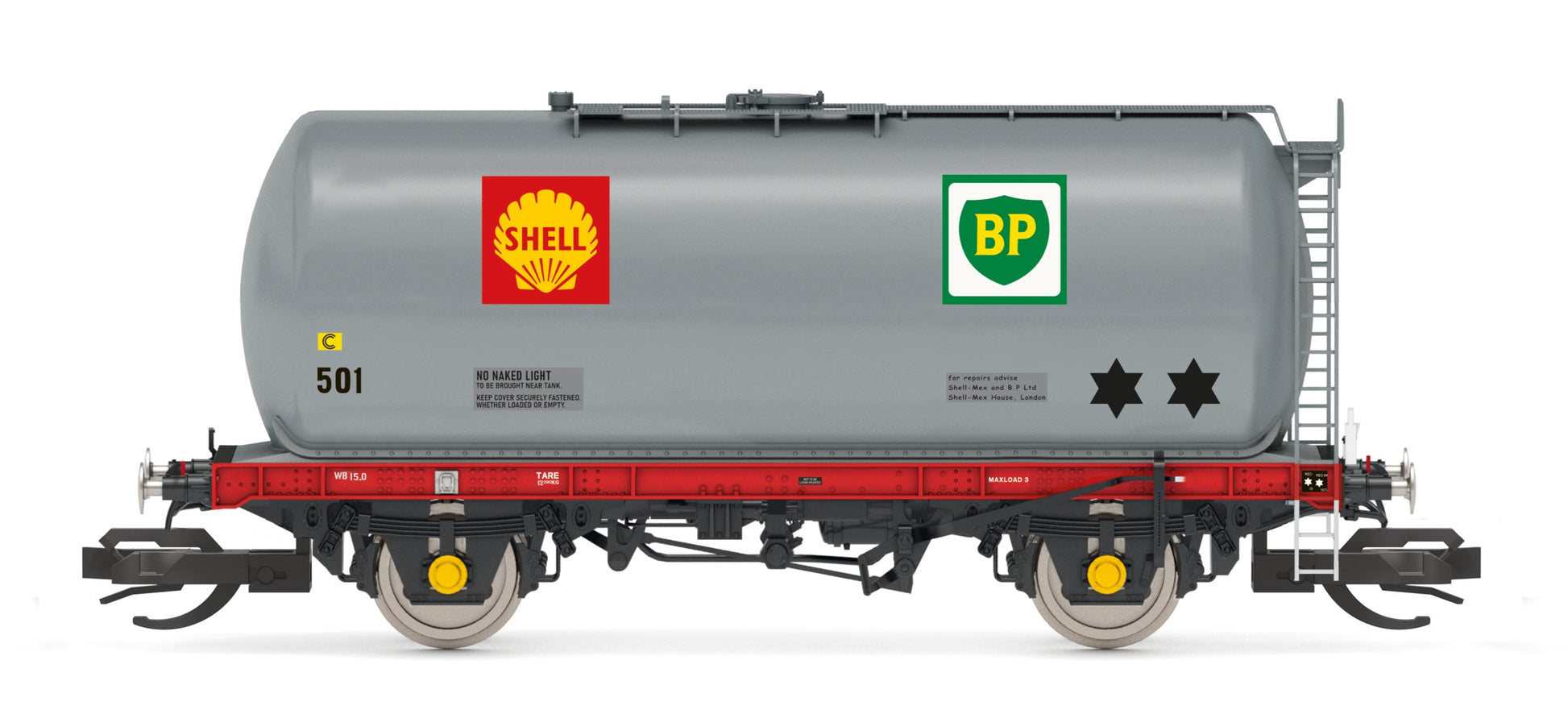 The TTA tank wagons were introduced by BR in the 1960s, with 1000s built to replace ageing tank wagons of smaller capacity that it had inherited from private-owner fleets. Used to transport oil and petroleum products, they were still being built into the 1970s, with the last remaining in service until the early 2000s. This TTA tanker has a plain grey tank with classic Shell-BP dual branding and has the fleet number 501.