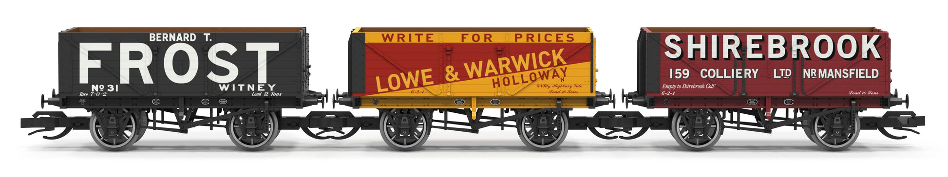 Each wagon finished in its own private livery, including the large 'Frost' lettering on black, 'Lowe and Warwick' on a bold red and yellow colour scheme, complimented by the maroon of 'Shirebrook'.