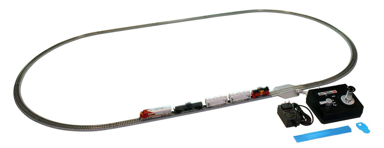 Each Kato N Scale Starter Set Contains a 3 x 4 oval of N gauge Unitrack, including a track feeder, a road crossing and rerailing track, and a book of directions for additional layout plans.