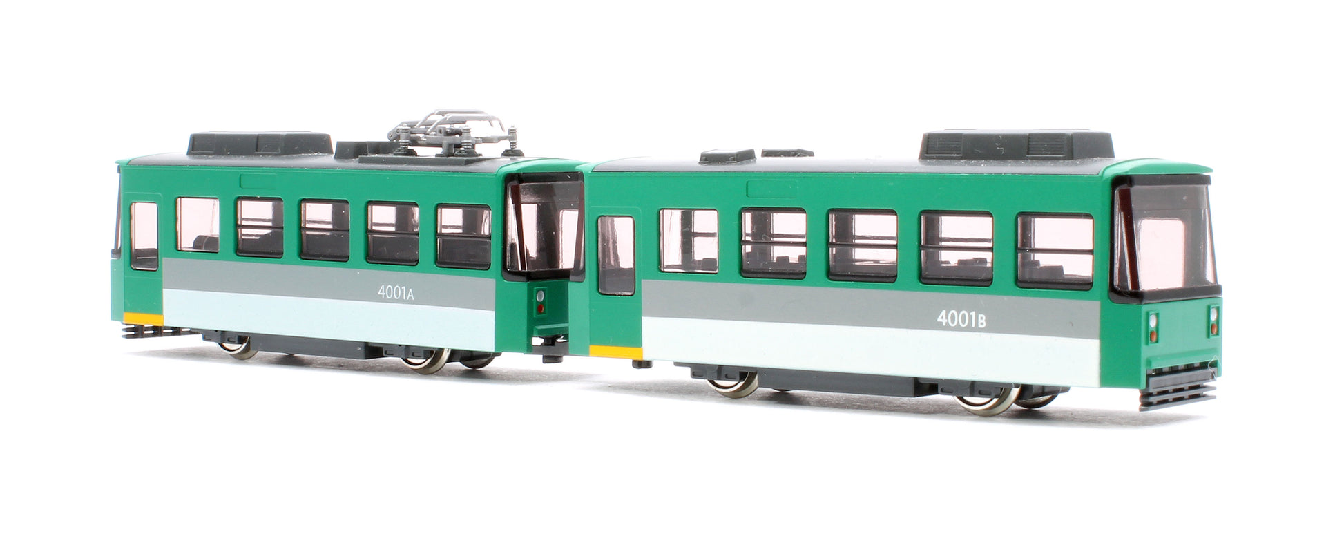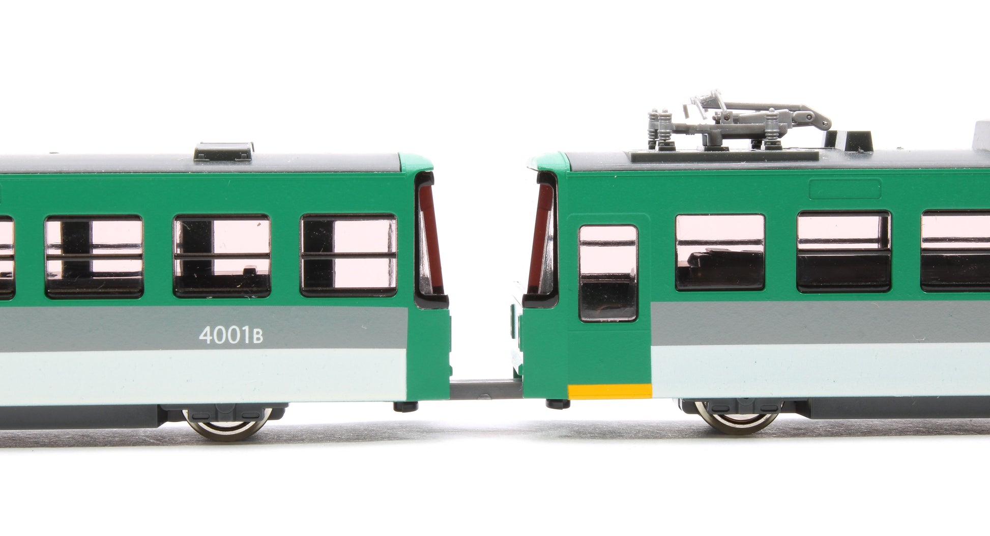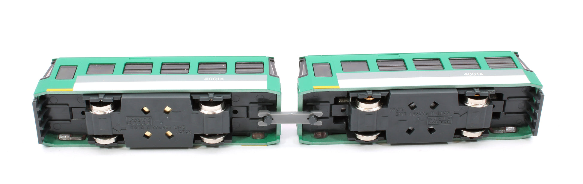 The popular Kato Pocket Train Series returns, now equipped with a new power unit. Adopting the newly developed small coreless motor for the power unit, the Pocket Line Train Series are remarkably improved in the function of opperation and performance. This set features a two car tram unit decorated in a green and two toned grey livery.