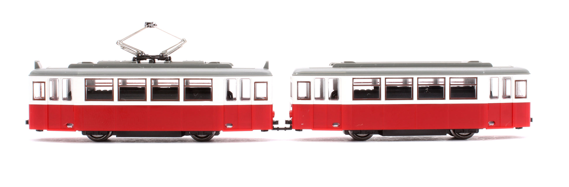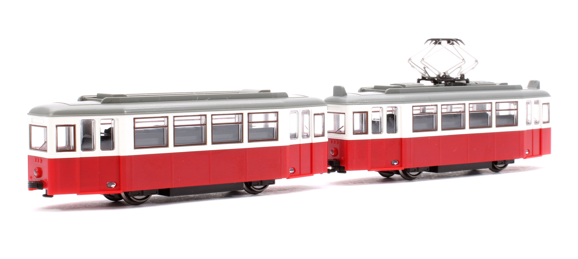 1:150 Scale model of a two car tram unit decorated in Red and White livery. This model features lots of expertly applied details as based on the prototype, a high level of body detail and excellent running characteristics.