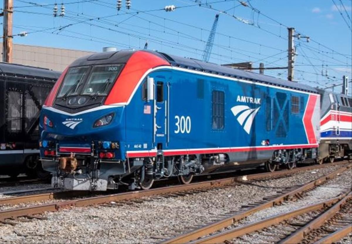 1:160 Scale model of a ALC-42 Charger diesel locomotive decorated in Amtrak PhVI livery.
