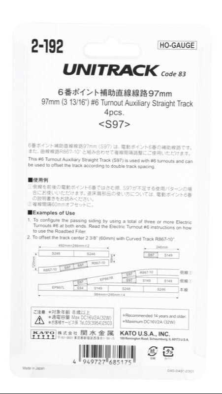 Kato 2-192 Unitrack (S97) Turnout Auxiliary Straight Track 97mm 4pcs