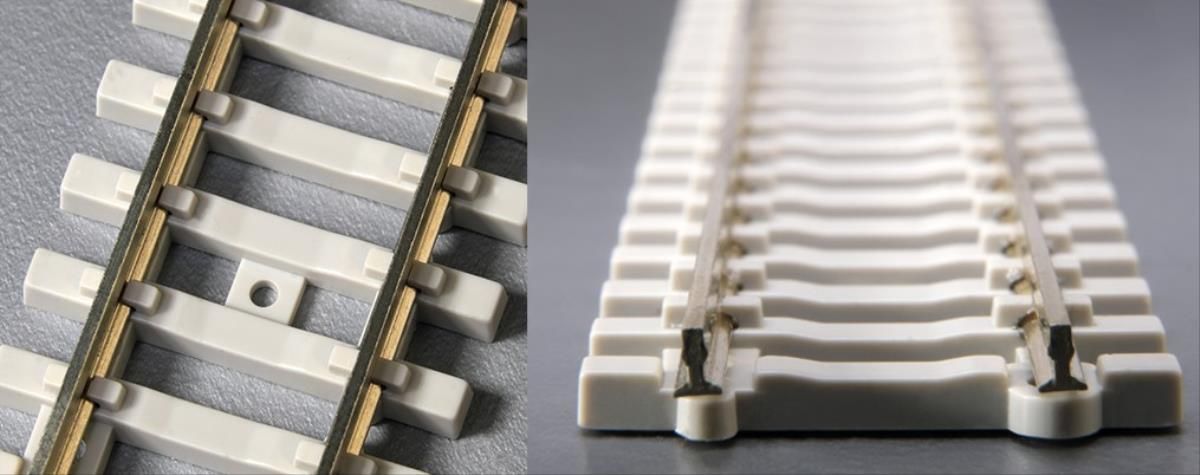 Section of flexible track with "Prestressed Concrete" style sleepers. This track moves freely to create long sweeping curves or tight radius curves for smaller spaces.