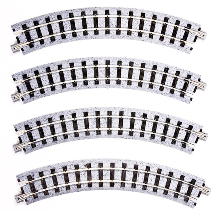 This pack contains four sections of 183mm radius curves with fitted rail joiners and a plastic ballasted base. Ideal for both 009 and HOe railway modellers.