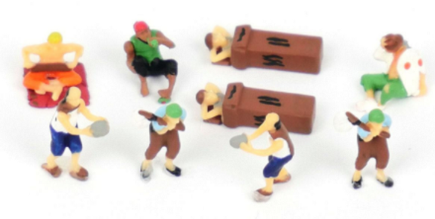 N Gauge figure set containing nine figures in different poses. This pack includes people sitting on blankets, sitting down outside doorways, carrying bindle sacks and even laying in a cardboard box.