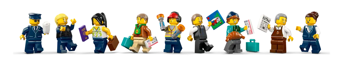 - MINIFIGURE ACCESSORIES – This toy airport set comes with LEGO® accessories, including 3 suitcases, 2 boarding tickets, marshaling wands, a sunflower lanyard, passport, newspaper, map and croissant