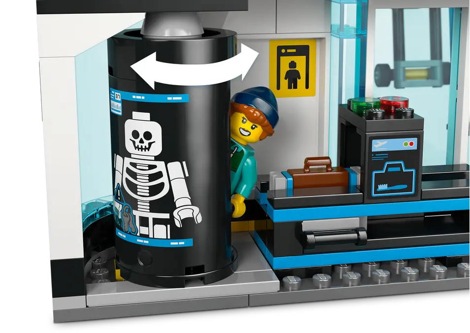 - REALISTIC FUNCTIONS FOR PRETEND PLAY – Kids can pass luggage through the toy scanner, rotate the walk-through metal detector to display an X-ray skeleton, change the departure display and more