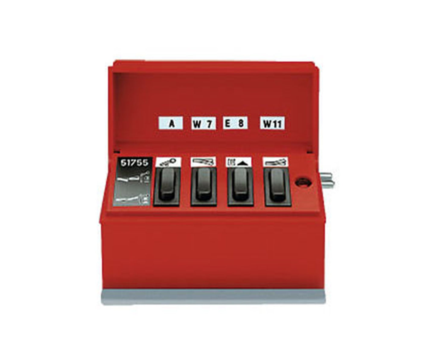 This control box can be used to operate up to four LGB turnouts, signals, uncoupler tracks, or other accessories. Each momentary rocker switch operates an accessory item. This control box is connected to a source of alternating current (18 volts) by means of the connections on the rear of the control box. The 60130 Converter is required when using a switched mode power pack (51090 or 51985). An LED indicates whether the control box is being supplied with current. Color-coded connections on the rear of the control box facilitate connections. Adhesive labels are included to identify what is connected to a switch on the control box.