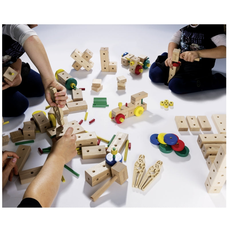 Using the special Matador pliers, the structures can always be taken apart and then re-assembled to form a new structure. The size of the wooden blocks which measure 4x4 cm are perfectly suited for the size of small children’s hands. The building instructions are illustrated, thereby enabling children to build on their own. Six different main construction sets in various sizes (ranging from 34 to 350 building parts) and sensible expansion sets allow children to build to their heart’s content.