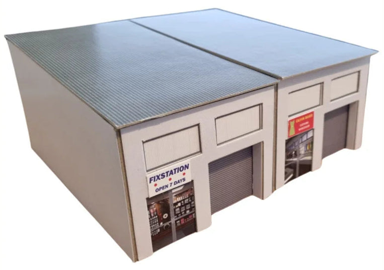 OO Gauge (1:76 scale) precision die-cut model card kit. Each pack includes the components to build 2 modern industrial units, each one measuring approx. 17.8cm long, 9.2cm wide and 9.0cm tall.