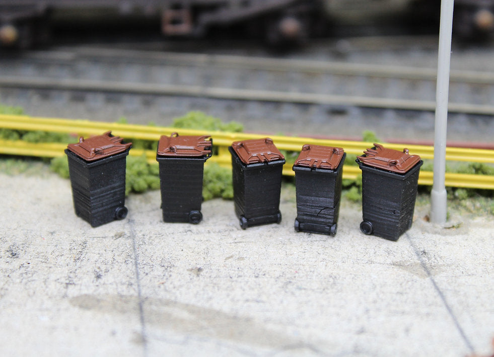 Goodwood Scenics BSWBBRNL5 Modern Wheelie Bins - Pack of 5 - BROWN LIDS