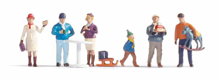 A woman in a white coat and a red hat is carrying a purple bag in her right hand and a present in her left hand. A man in a dark blue hat and blue jacket staring into his mug of mulled wine and a woman in a purple jacket and white skirt are standing at a bar table. A child in a green hat, yellow scarf and dark blue jacket has his hands clasped behind his back. The set also includes an elderly man carrying three gifts and another man holding a rocking horse under his left arm.