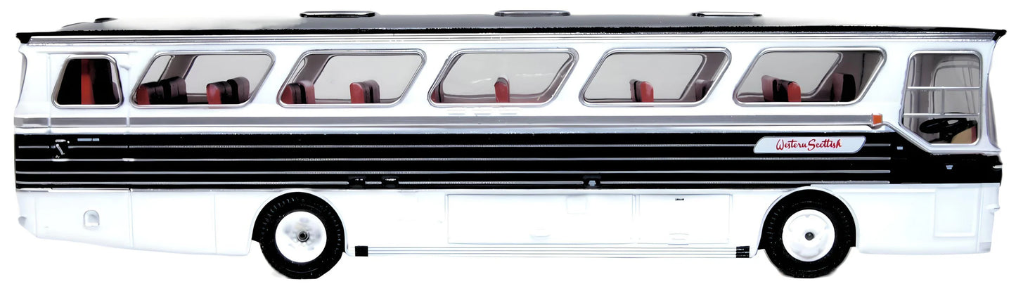 Our latest single deck 1:76 scale Alexander M-Type coach was a motorway coach and makes only its second appearance in the eye-catching black and white livery of Western Scottish SMT, registered HSD 707N from 1974. The destination board sees it travelling from Glasgow to London as the Number 2. The address of the Western SMT Co Ltd Nursery Avenue Kilmarnock is printed behind the nearside front wheel.