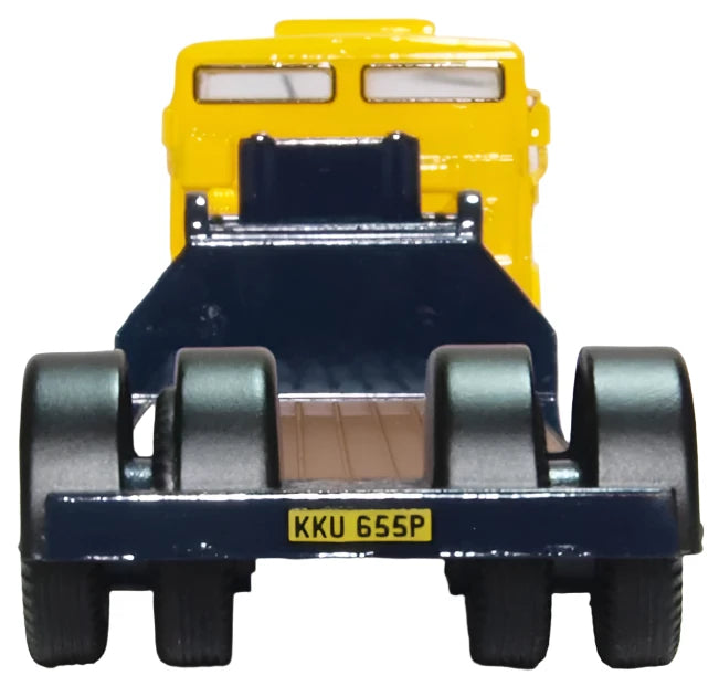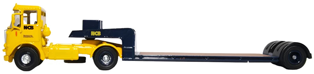 Dating from the mid 1970s with registration plate KKU 655P, the Atkinson Border is pulling an extensive low loader working for the National Coal Board Mines Rescue department. The cab is decorated in bright yellow with contrasting dark blue to the low loader section and wheels. The flatbed floor is given a realistic brown 'timber' finish and carries the NCB logo on the side edge. The detail is all in the cab which features the distinctive Atkinson radiator with chrome surround to the black grille. A destination board above the cab window reads Mines Rescue, reminding us of the dangers which miners in the coal-mining industry face on a daily basis.