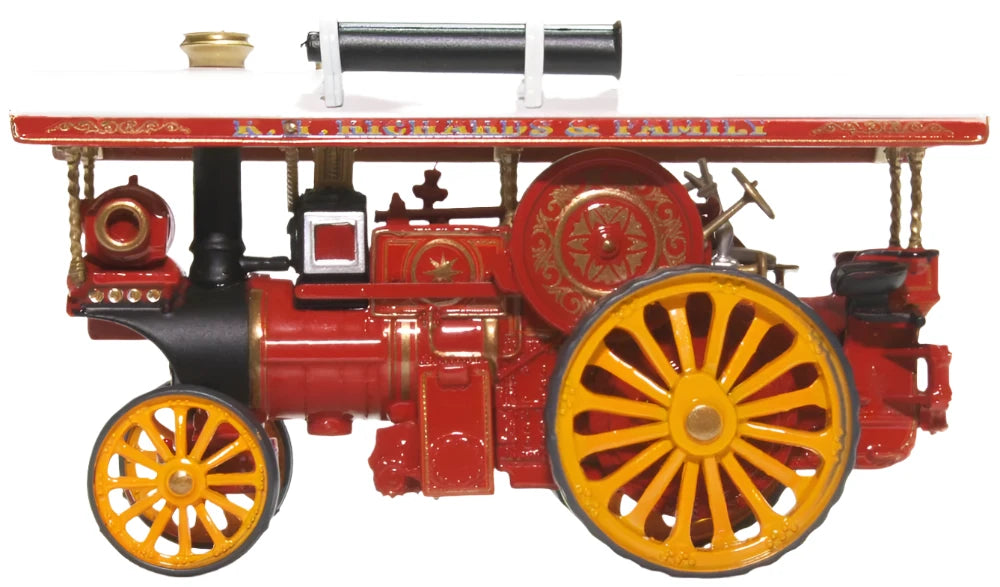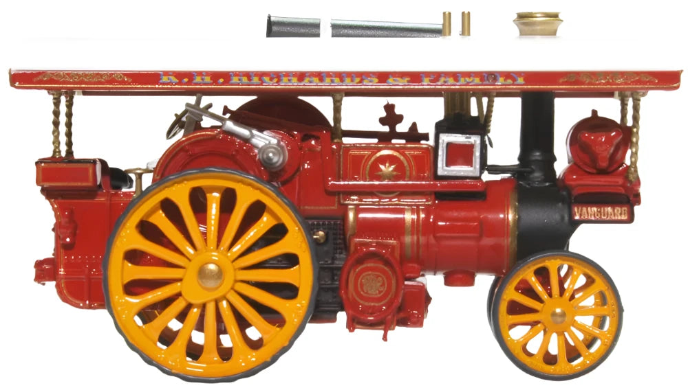 An addition to the Oxford Showtime series is the magnificent Burrell 8 nhp DCC Showmans Road Locomotive No. 2342 and named 'Vanguard'. Built by Charles Burrell & Sons Ltd. Engineers of Thetford in Norfolk in 1900, our model is decorated in the rich Crimson Lake with white roof and cream roof underside. As is usual with the Showman series, there is a wealth of intricate decoration applied in gold including steering wheels, wheel centres, roof poles as well as the black and gold stack. The owner's name H R Richards & Family is printed along the edge of the roof in dropped shadow work. Like many Showmans engines of the period, the real-life Vanguard has been a familiar sight particularly at the West Country Traction Engine Rallies