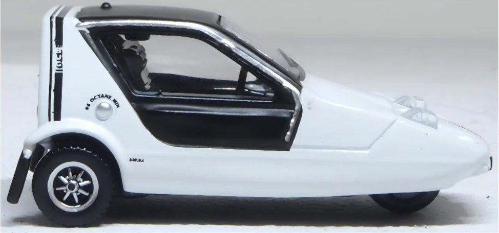 The 1970 Bond Bug emerges in pristine white with black masking, in sharp contrast to the bright orange 1:76 scale car which launched the series. The wedge-shaped three wheeler with its characteristic frog-eye headlights is enhanced with silver wheels and windscreen wipers; the BUG name is printed vertically on both sides of the car above the wheel arch, again in red on black across the rear and vertically down the front of the channelled bonnet. It is registered AME 193H from the first half of 1970. Our model is based on the Bond Bug 700ES which offered more ergonomic seats a well as more padding over the engine cowl, twin mud flaps, an ashtray and rubber front bumper and a spare wheel.