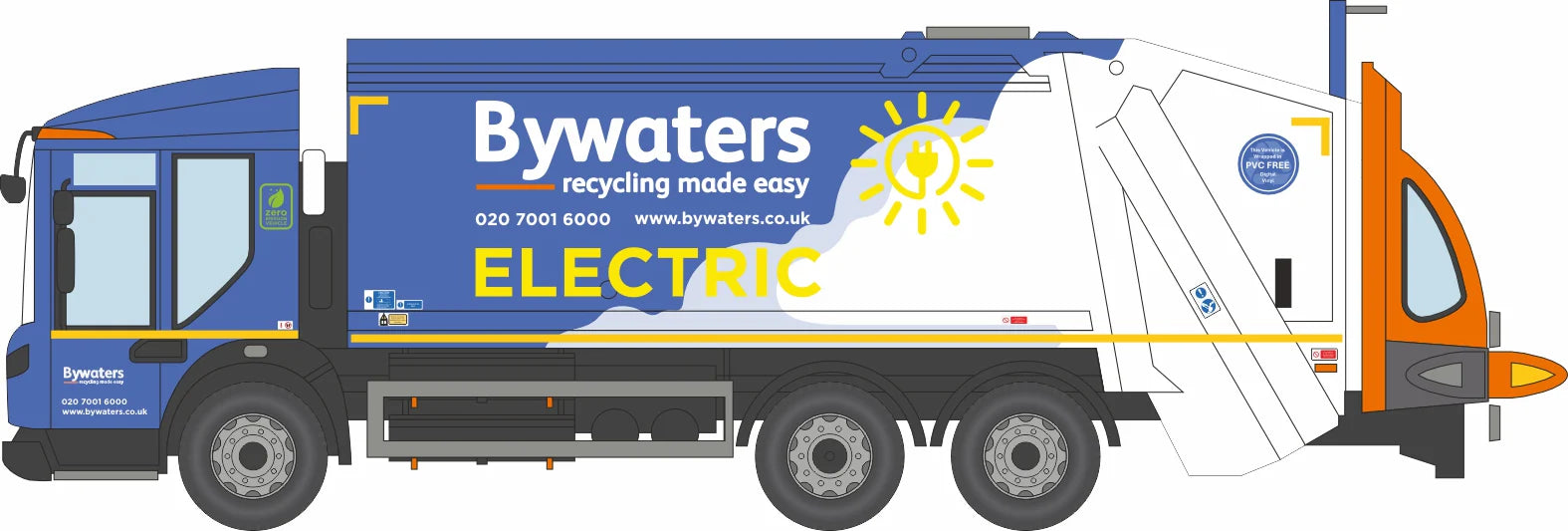 1:76 Scale Model of the Dennis Eagle Refuse Truck Bywaters. Manufactured by Oxford Diecast one of the worlds leading producer of Scale Model vehicles.