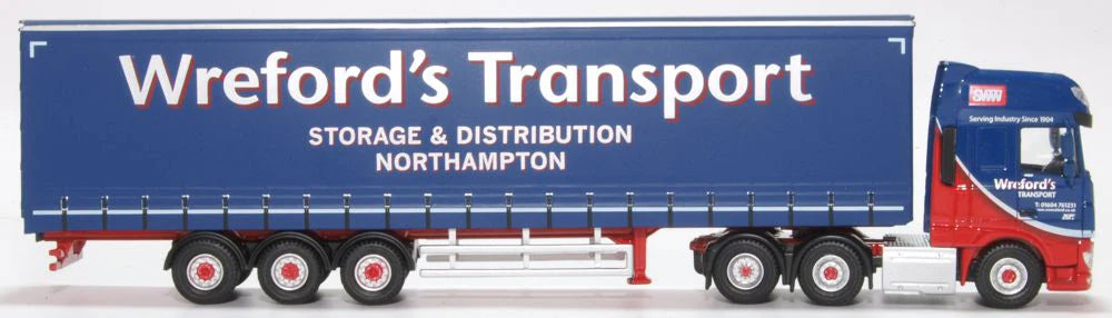 Our super modern state-of-the-art Euro 6 cab, striking bright red, dark blue and silver livery of Wreford’s Transport. Registered KX64 NYC, the Northampton based company is employing the vehicle, with curtainside trailer, for their storage and distribution business. The detailed graphics on the cab boast the company Serving Industry since 1904 – above the cab window - whist the cab doors feature their telephone number and website address. These details are also repeated across the back of the trailer, including the fleet number SWW285. The trailer itself is decorated in the same rich blue with silver roof. We especially like the finely worked curtainside side straps which look so realistic.