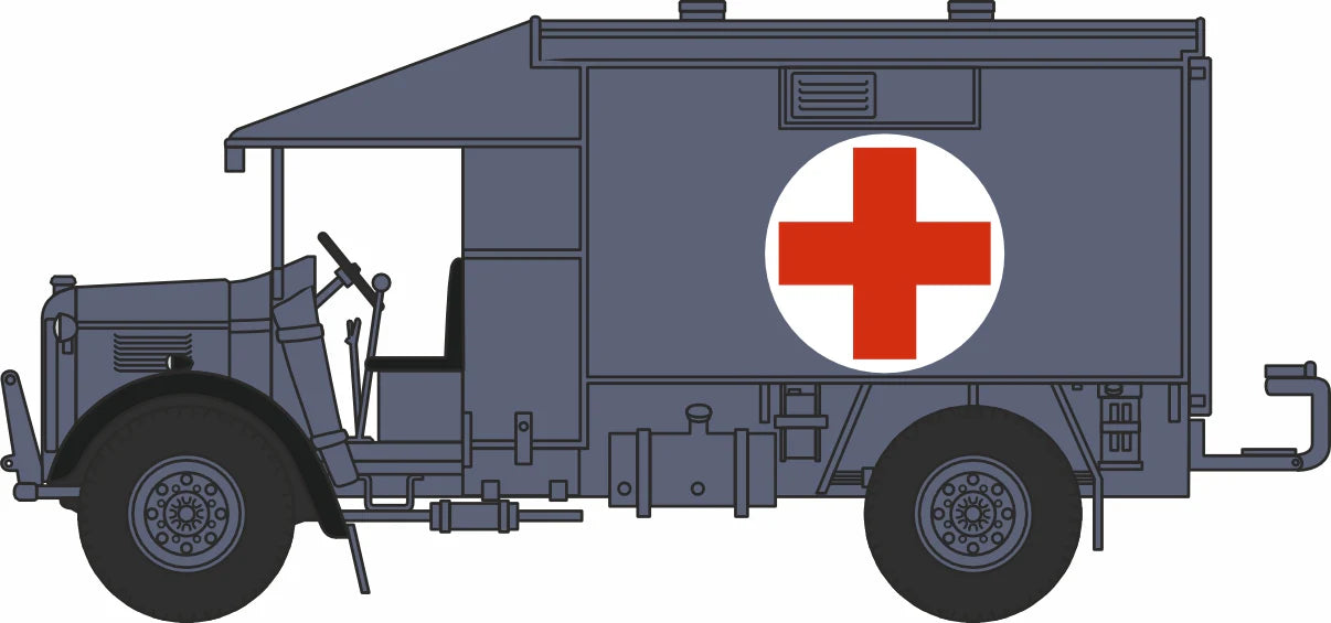 Our model is as deployed by RAF Transport Command in 1951. The Command was responsible for all transport aircraft of the RAF. Our vehicle is decorated in the RAF blue grey colour scheme with black front mudguards. The interior is also blue grey with black seats and the military style rolled canvas doors are also blue grey. The ambulance markings feature as a red cross on a white circle on the roof, both sides of the vehicle, the rear doors and also above the front split windscreen. The military registration plate is 00 AA 78 printed on the back and front of the ambulance while the yellow and black bridge plate on the front wing carries the number 4 with the RAF roundel above.