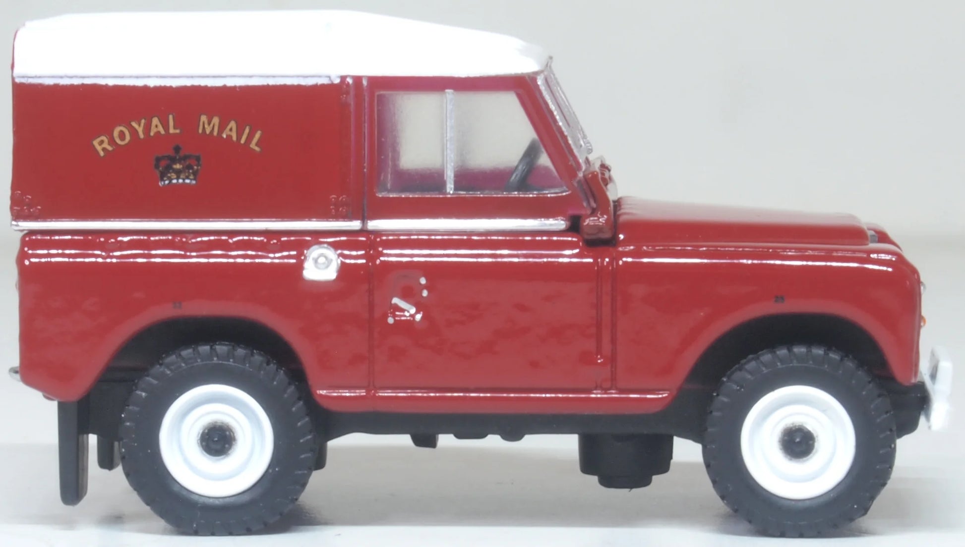 This short wheelbase Land Rover Series III proved highly popular when Oxford first released it in 1:43 scale. It now makes its 1:76 scale appearance in exactly the same Royal Mail livery. It is decorated in bright pillar box red with a white roof and black interior, registered MFS 345P from 1975. The number plate is fixed to the centre of the grille on this release and there is also an additional board fixed to the white bumper printed KINGIE. The exterior is also finished with contrasting silver trim.