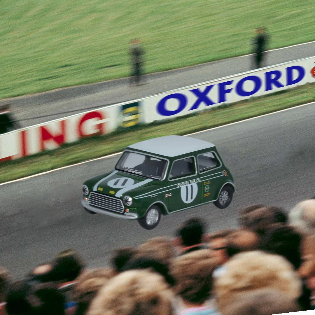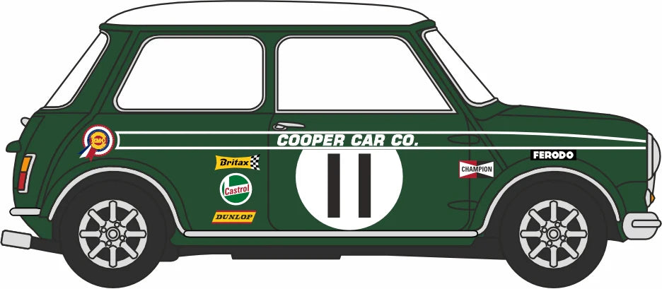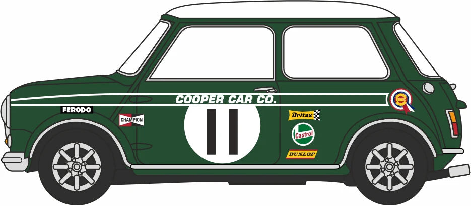 This 1:76 scale model is a replica of John's Mini Cooper in which he made his last appearance at Brands Hatch in 1968. Painted dark green with white roof and decorative stripes, his white race number 11 adorns both the doors and the bonnet. The BMC rosette features below the rear side windows, along with a mass of sponsorship decals including Ferodo and Castrol. The interior, including the steering wheel, is completely black. A particular detail sees the headlights with black 'taped' glass, just like the real thing.