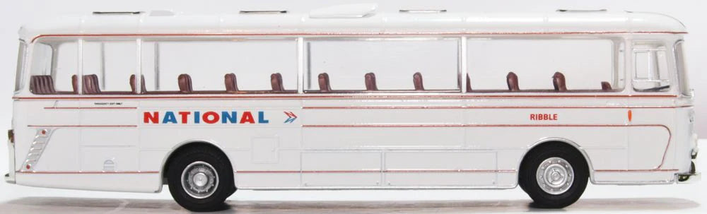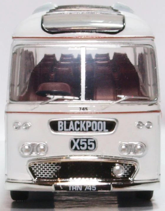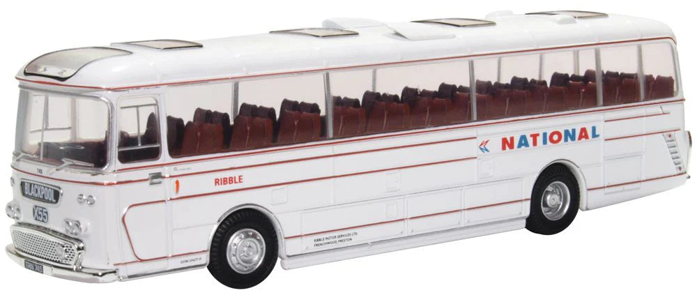 The Ribble Motor Company started operating in 1919 and grew into the largest bus and coach operator in the North West. It became part of the National Bus Company in 1969. In 1972 its famous cherry red and cream livery was changed as part of NBC’s corporate identity to white on the new single deckers. Our single deck coach is typical of this era, registered TRN 745 but still featuring the Ribble Motor Services name on the rear and their address in Frenchwood, Preston on the side behind the front wheel. The familiar red and blue National graphics are printed on the sides and rear of the vehicle and a final detail sees the coach going to Blackpool as the X55.
