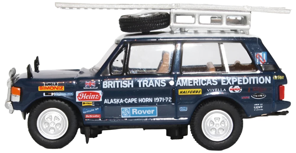 A 1:76 scale replica of the British Trans-Americas Expedition vehicle, its detail is astounding. Registered VXC 868K from 1971-2, its dark blue body colour with tan interior is complemented with a white masked roof with the Expedition name and route - Alaska to Cape Horn 1971-2 also printed white. That's where the fun starts! The remaining extensive decoration is devoted to sponsors with Rover featuring prominently on the front doors and other diverse names from Heinz to Halfords printed in a wealth of colour covering every available surface. Fully equipped for the adventure, we see two ladders and spare wheels fixed to the roof and some hefty looking bull bars across the front grille with attached spotlights. The team were obviously fully prepared for the unexpected!