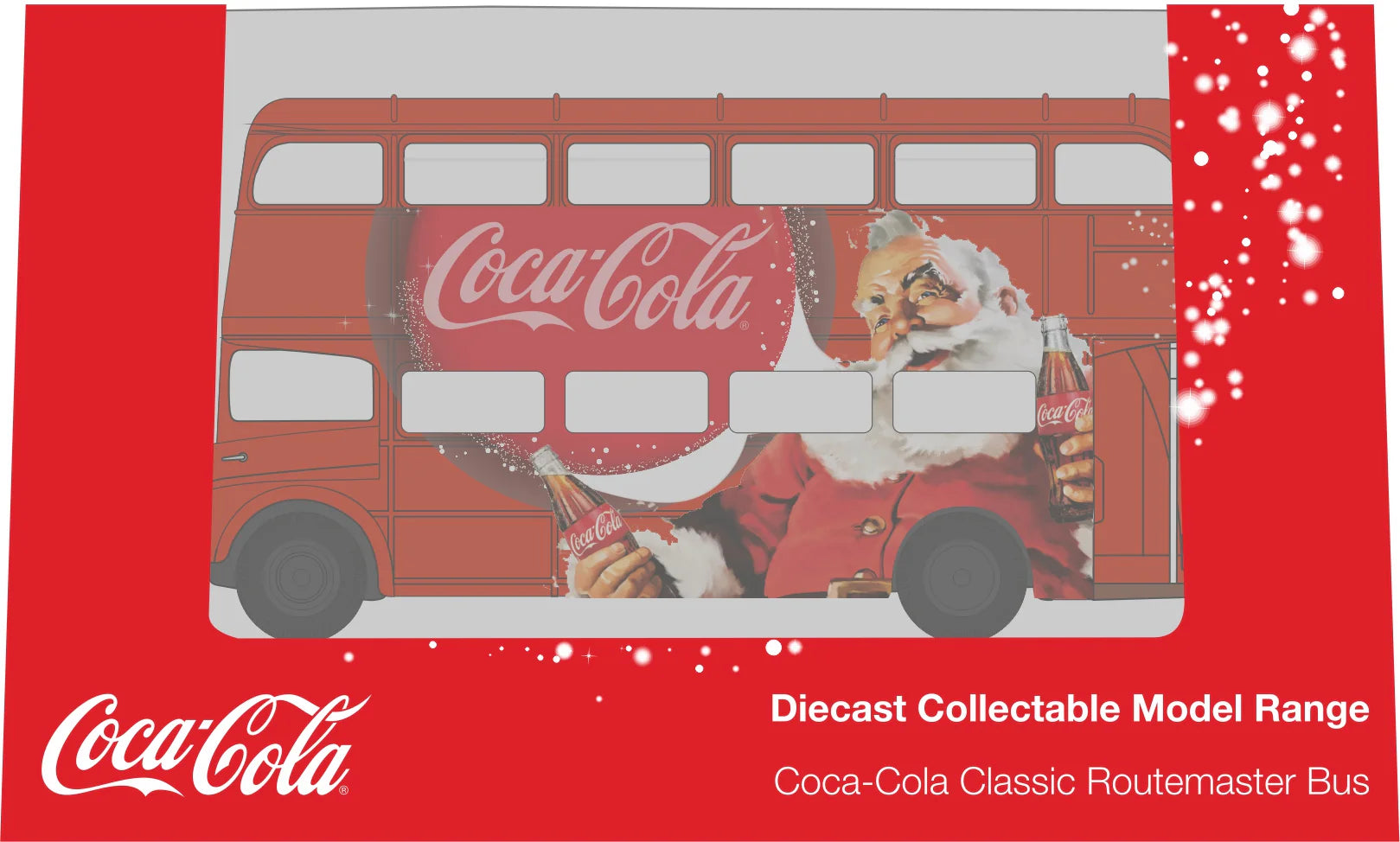 A great piece of seasonal fun and an appealing gift for bus enthusiasts and collectors of Coca Cola liveried models of all ages! Our 1:76 scale double decker red Routemaster, registered SANTA 1, features larger than life and very jolly looking Santa resplendent in his Christmas robes complete with flowing beard, printed on each side of the bus, holding a bottle of Coca Cola in each hand. The advertising panels and front/rear destination boards carry the company's logo in white to complete the effect.