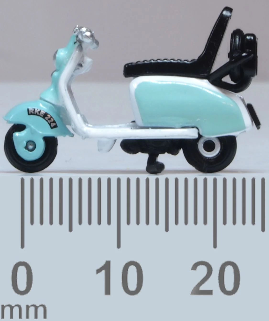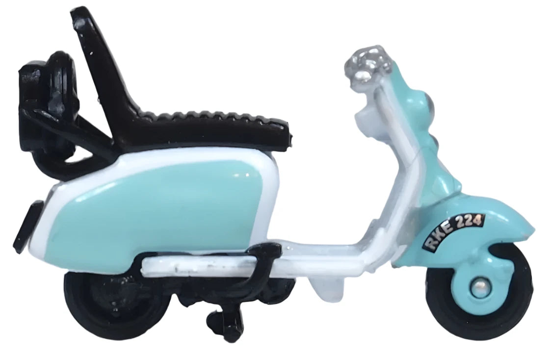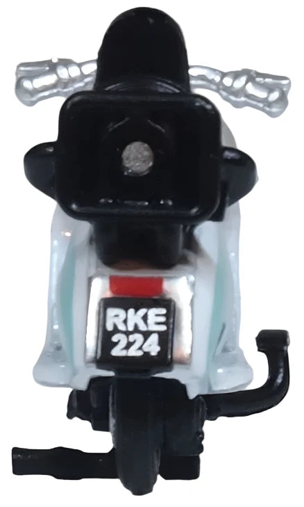In a summery pale blue for the main bodywork with white front guard and white wheels, all enhanced with chrome detailing. The seat, made for a pillion passenger too, is moulded in black. The handle bars and brakes are finished in chrome, as is the headlight surround on the front. Our brand new model is registered RKE 224, so definitely pre 1962.