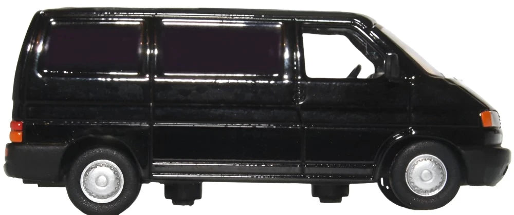 For this 1:76 scale model, we see it decorated completely in black apart from the chrome wheels, the Transporter name across the back and the VW badge on the front of the radiator grille. The interior is also black with a dark grey steering wheel. Registered Y449 PLD from 2001, the model features a right hand drive configuration.