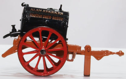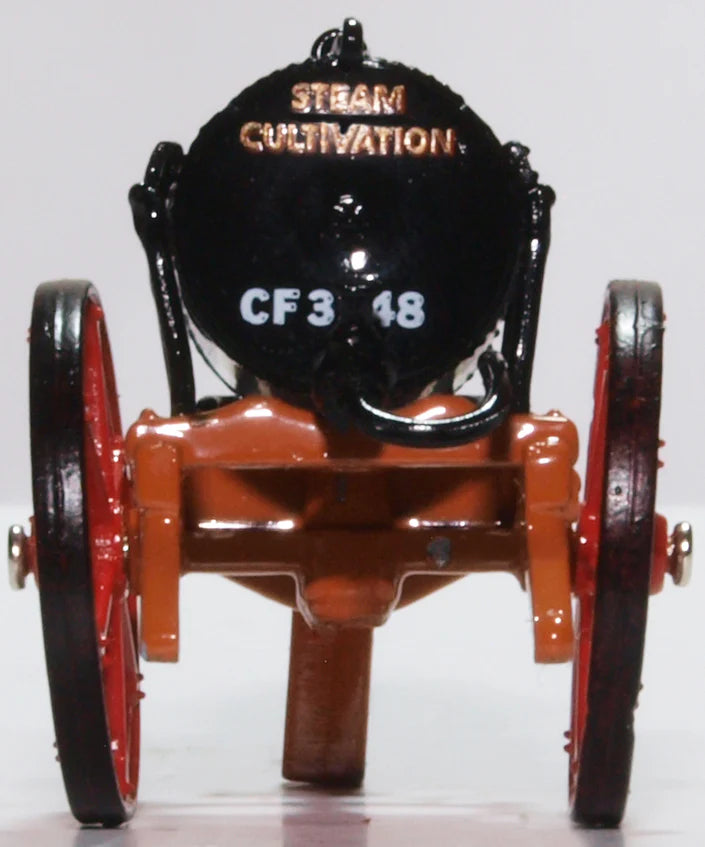 The black tank is sitting on a brown frame and has bright red wheels. The water supplier's details - Alan Sparkes of Stanton Drew, Bristol - are printed on the sides of the bowser, which is registered CF 3348. The rear of the tank indicates its use for steam cultivation. Put it alongside your steam agricultural engines for extra interest.