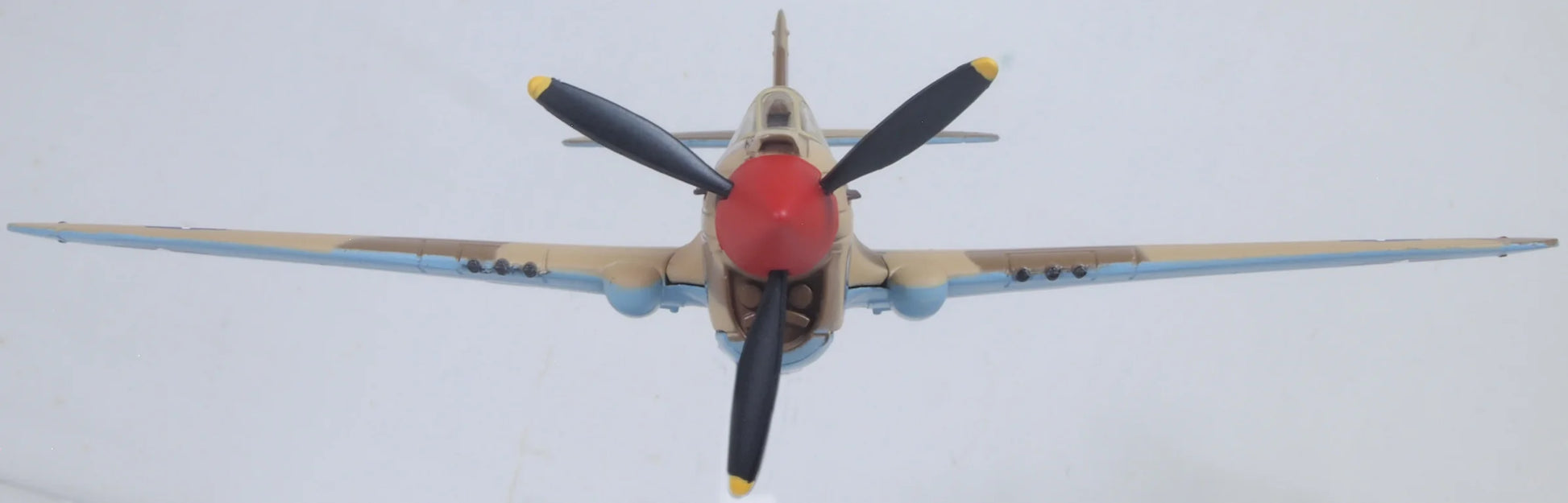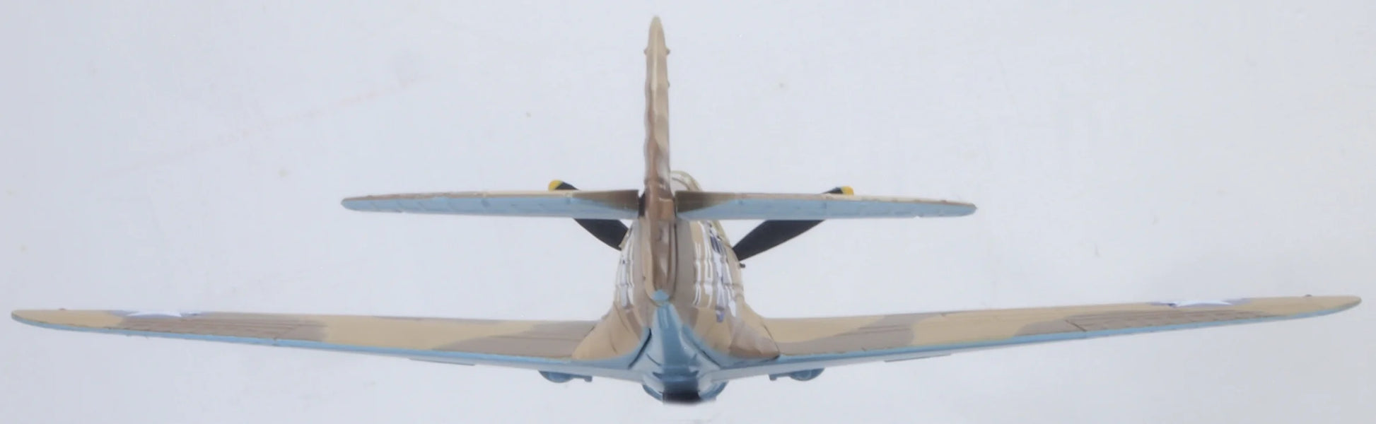 The aircraft also displays the risqué́ artwork created by Cpl Joseph E Pumphrey on the tail fin displaying a pin up girl of the time. However, her rather naughty presence was short-lived and was subsequently removed under commanders’ orders. But – ‘Miss Memphis’ lives on in 1:72 scale miniature on our model of the P40, a faithful reproduction of the original aircraft. The Warhawk is decorated in the desert camouflage of earth brown and sand to the upper body with azure underside. Its X43 Star lettering is painted white along the sides with the US star contained within a blue circle. Further detail sees a red propeller spinner, silver pitot tube and propeller blades, tyres and gun turrets in black.