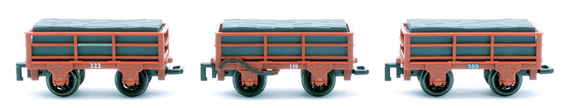 Both sets contain two unbraked and one braked vehicle, with the OO-9 couplers for the outer vehicles, fitted into an NEM-style coupler box. the wagons themselves are interconnected by a simpler discrete coupling for authenticity. The wagons also carry a removable slate load.