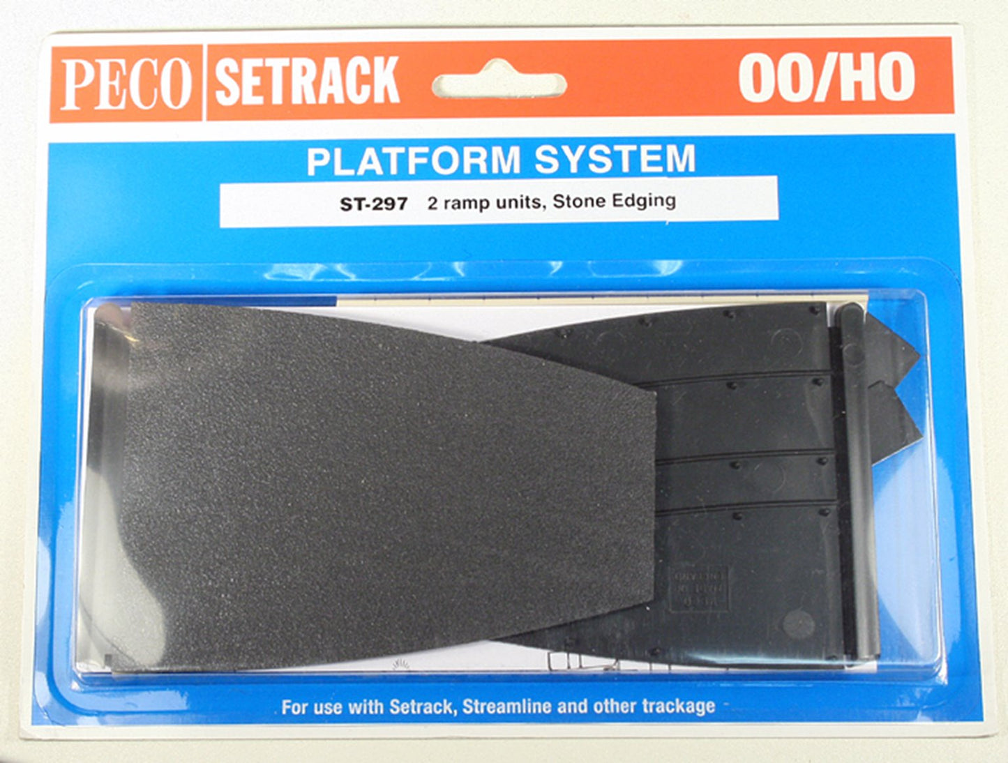 This model platform system is ideal for use with Peco 00/H0 Setrack, Streamline and any other unit trackage system which conforms to British Standard geometry. Straight units are 168mm long, matching the Standard Straight (ST-200). The self adhesive printed strips supplied match either brick or stonework and can easily be applied to the platform edges. Platforms can be made to any length by simply clipping the units together. As supplied the units fit a standard track configuration but it is easy to adapt to suit other situations; just cut the platform surfaces to any of four widths by following the scribed lines on the back. Ramps can be made to one of two widths, and have curved sides to match the second radius curve.