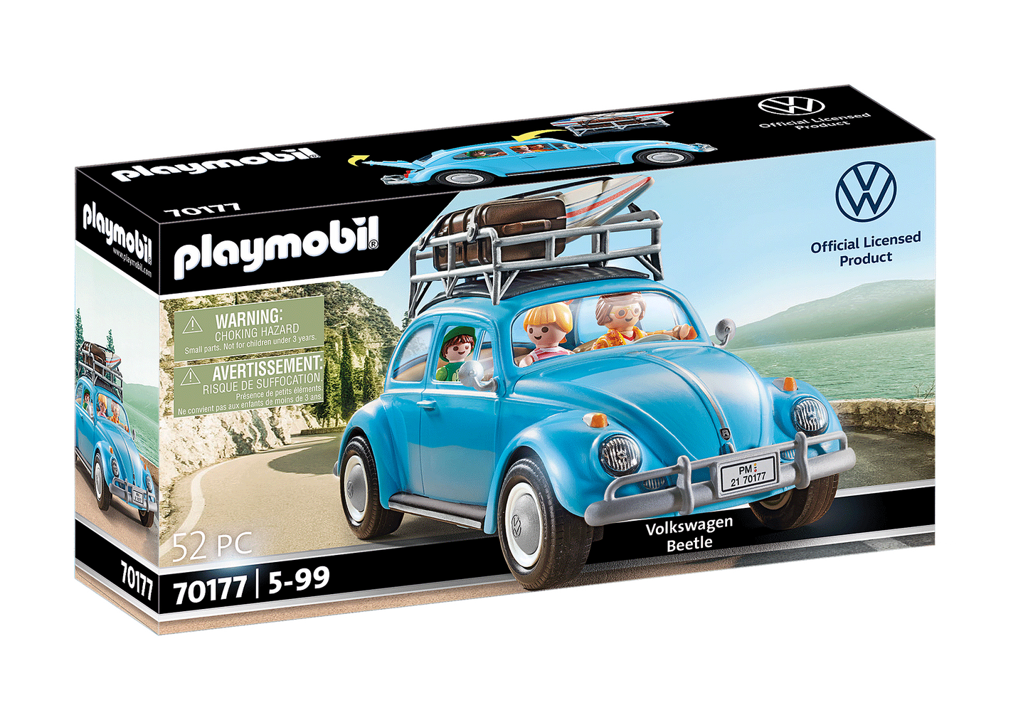 The VW Beetle is a real classic. Now the cult car with its unmistakable shape is entering the cheerful PLAYMOBIL world. Of course, the PLAYMOBIL Beetle has all the characteristic features that make it so unique, such as the curved fenders, the VW logo, the vertical windshield, the blue paint and the typical rear hood with a 4-cylinder boxer engine. After removing the roof, the lovingly designed interior with beige seats, dashboard and steering wheel is revealed. On the back seat there is space for the child, as well as a cool bag, sand toys and towel. Suitcase and surfboard can be strapped to the roof rack. Now it's time to get in and go to the beach! The playset contains three PLAYMOBIL figures, a Volkswagen Beetle by PLAYMOBIL with roof rack, removable roof and tailgate that can be opened, surfboard, cool box, sand toys and many other accessories.