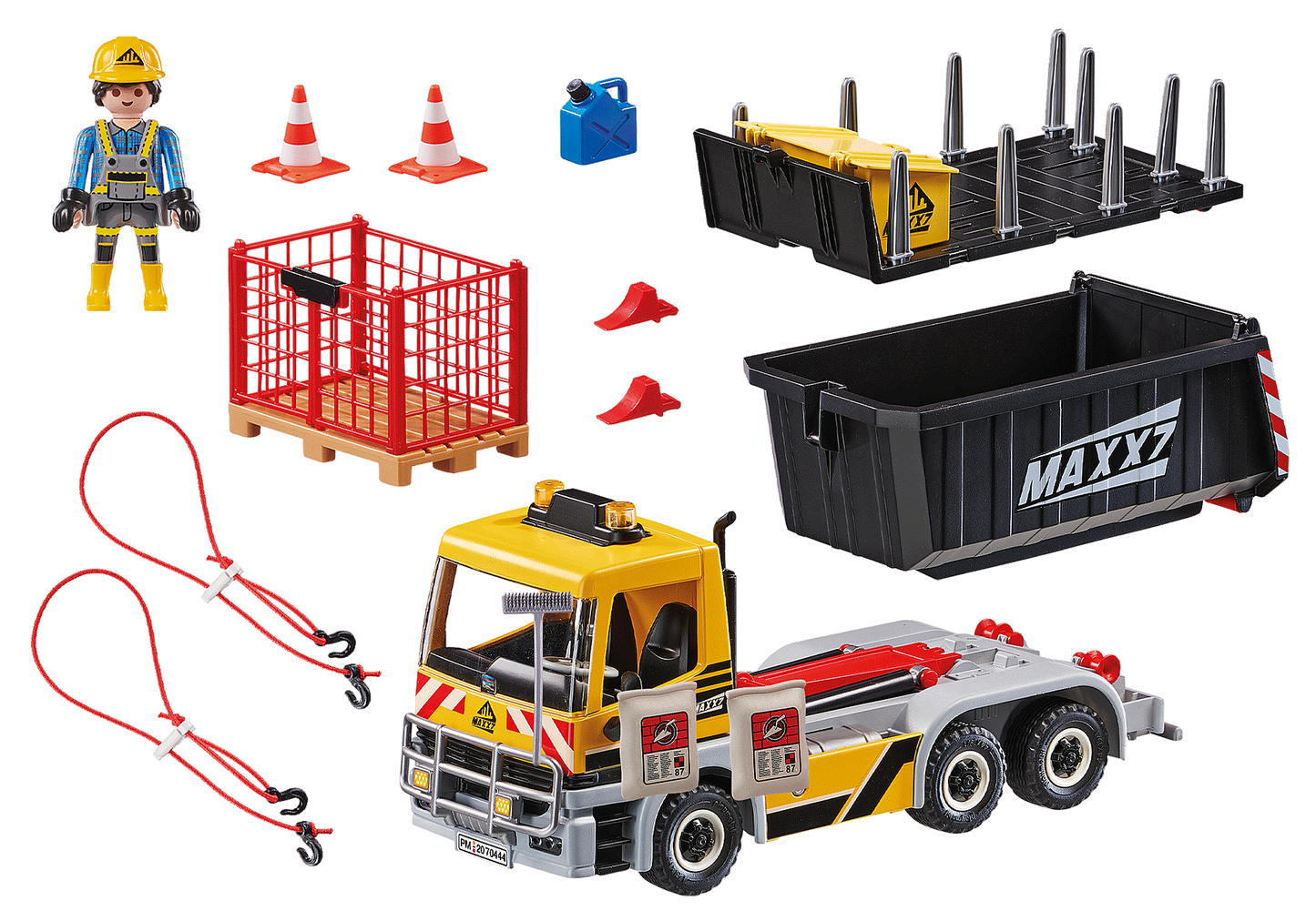 Heavy materials often have to be transported on the construction site. For this purpose modern trucks are used. The body of the truck can be changed flexibly: The trough is used for transporting bulk material. When the worker arrives at the construction site, the trough is unloaded first. Carefully the lifting device is set in motion and the trough is lowered to the rear. Thanks to its practical rollers, the body is unloaded in no time. Then the construction worker starts to load the stake trailer in order to bring equipment, broom, guide cone and canister to the next construction site. The playset consists of a PLAYMOBIL construction worker with helmet and gloves, a truck with swap body, a trough, a stake trailer, an equipment box with lid, a petrol canister and many other extras. The roof of the truck driver's cab is removable. The truck is RC-compatible and can be upgraded with the RC module set (art. no. 6914).