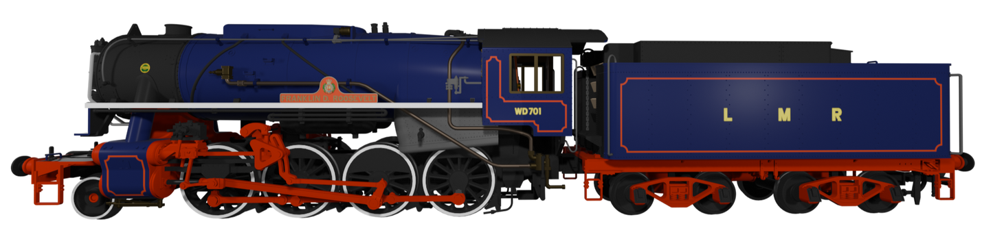 This locomotive was built by Baldwin as works No.3278 in 1944. It was sent straight to France in 1944 and, at the cessation of hostilities, the locomotive was given to the Italian State Railways where it was absorbed into the 736 class and renumbered as 736.073. In 1959 it was sent to Greece after being sold along with 25 other locomotives. Eventually the engine was bought and moved to the UK in 1984 and based at the Mid Hants Railway. The engine was given the name Franklin D. Roosevelt and restored to operation. The engine was painted in a LMR inspired livery of blue with red lining, but featured extra embellishments including red motion and tender bogies, whitewall tires and white-edged running boards.