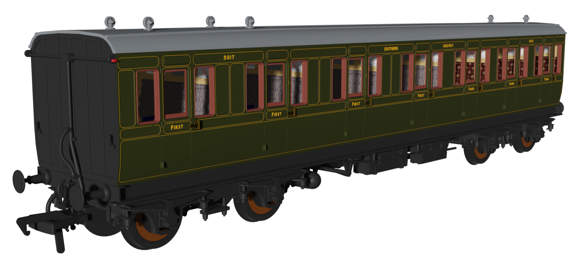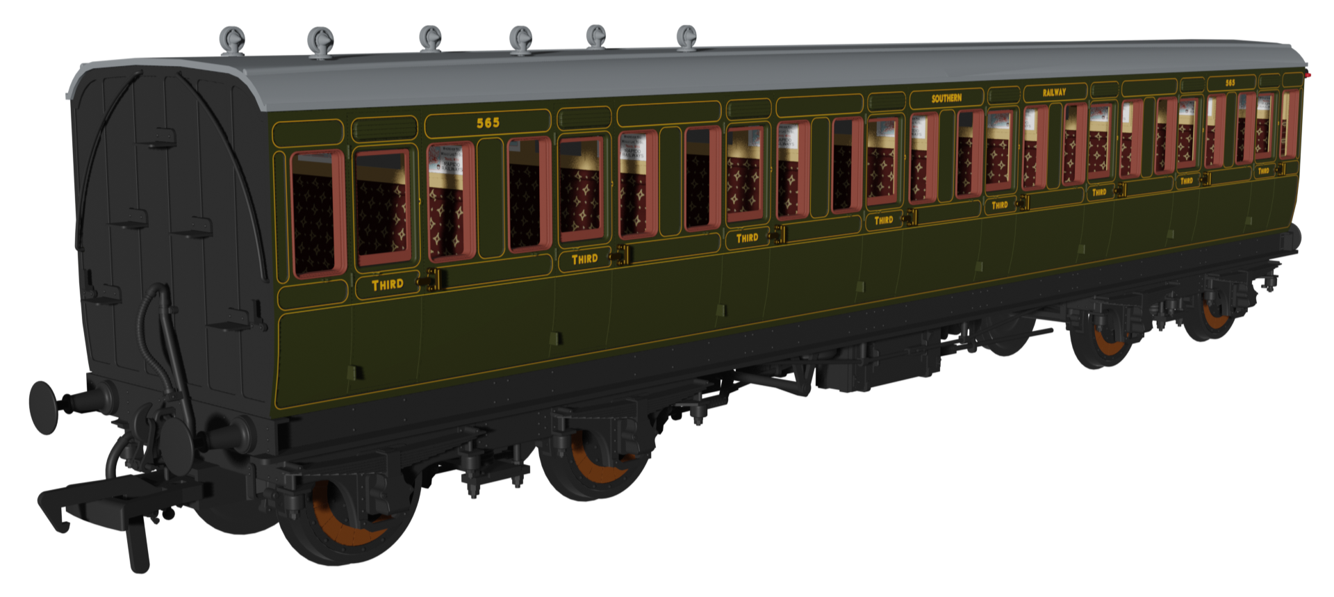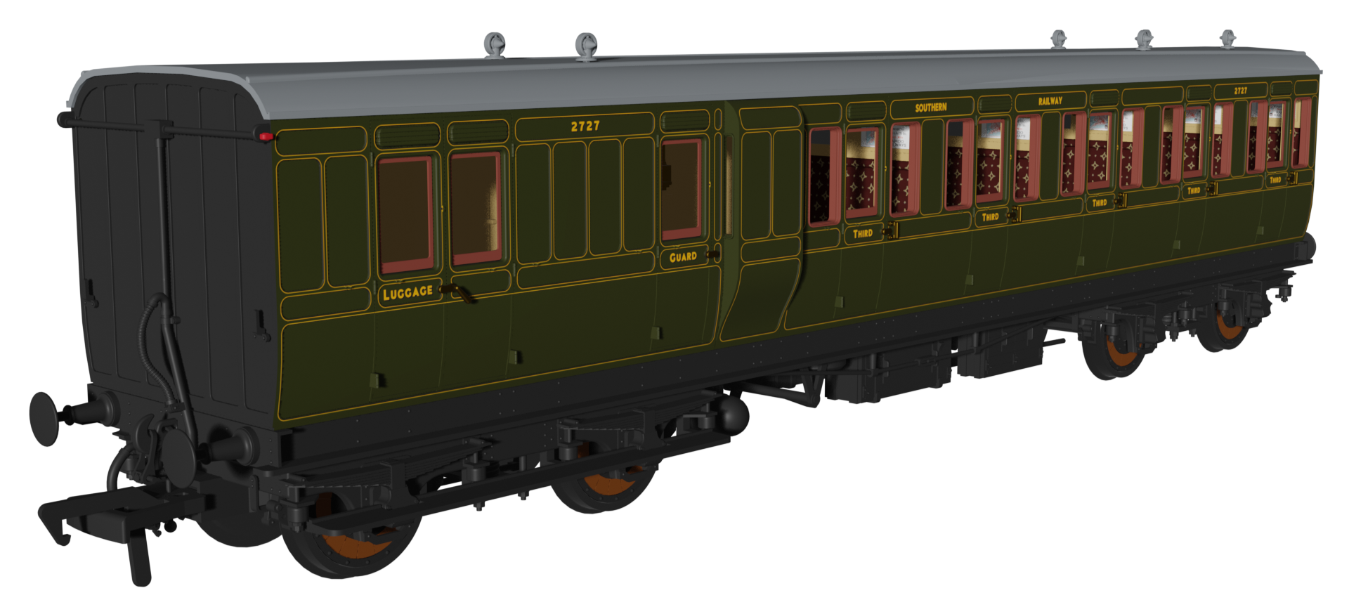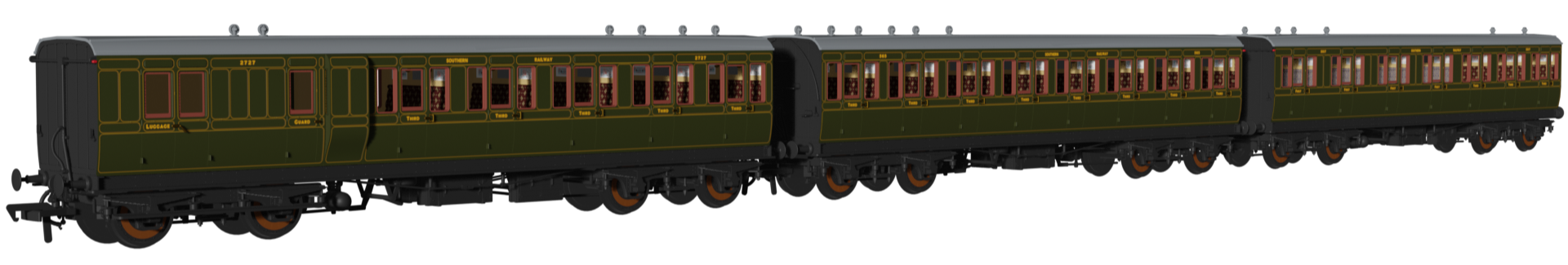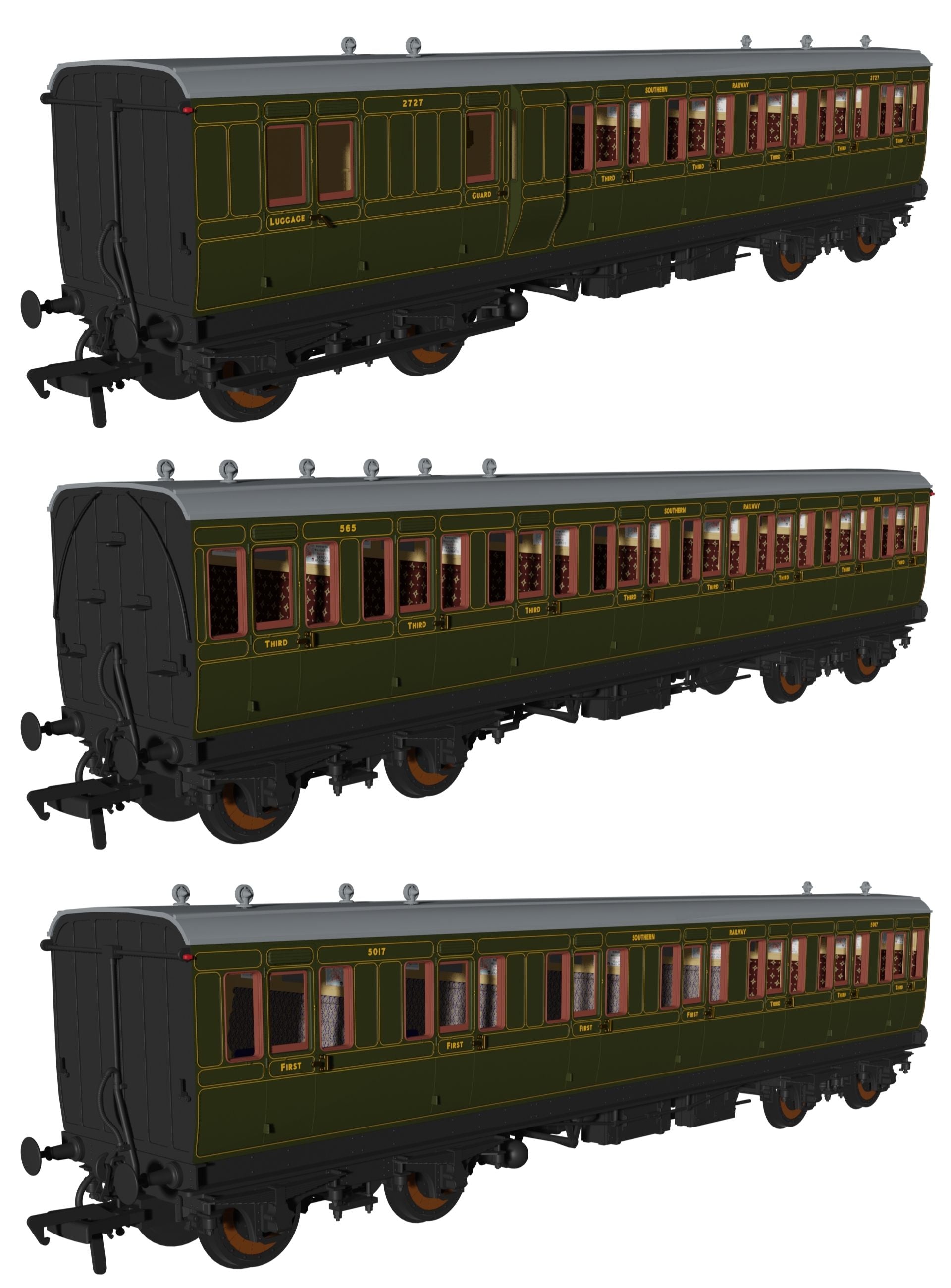 Rapido Trains UK 978213 'Evolution' 48' SR Olive Non-Corridor Carriage No.2727, 565 & 5017 Triple Pack