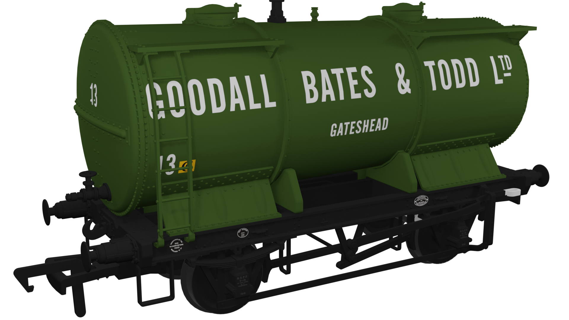 The wagons were loaded through the two manholes on the top of the barrel and were emptied at Chilwell by releasing the end door and lifting them at the fixed end of the wagon to tip out the contents, which was further aided by the conical shape of the barrels. These were highly unusual wagons, as they appeared to be similar to their conventional liquid tank wagon counterparts but instead carried powder. They also featured underframes made from pressed steel components, which was a speciality of The Leeds Forge Company.