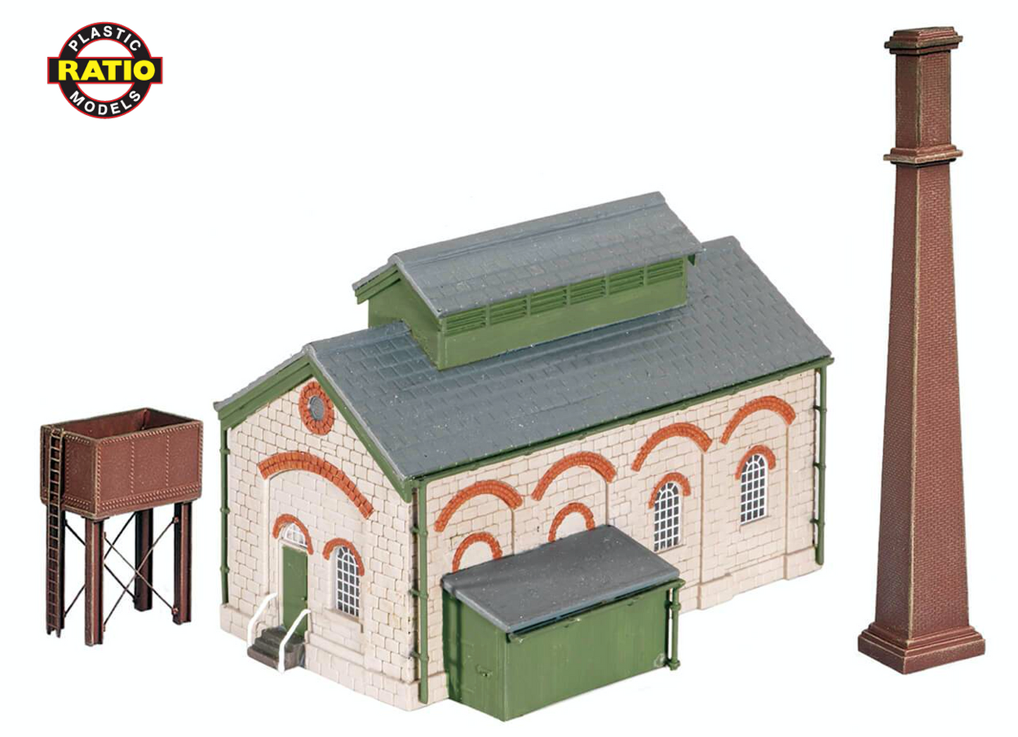 This versatile building would contain a boiler to provide steam either for a pump raising water or to generate electricity for a small factory. Sometimes a short siding was provided alongside for coal deliveries. Kit includes the main building, brick chimney, water tank and outbuilding. Supplied with some pre-coloured parts, painting and/or weathering can add realism; glue is required to complete this model. Footprint 95mm x 65mm