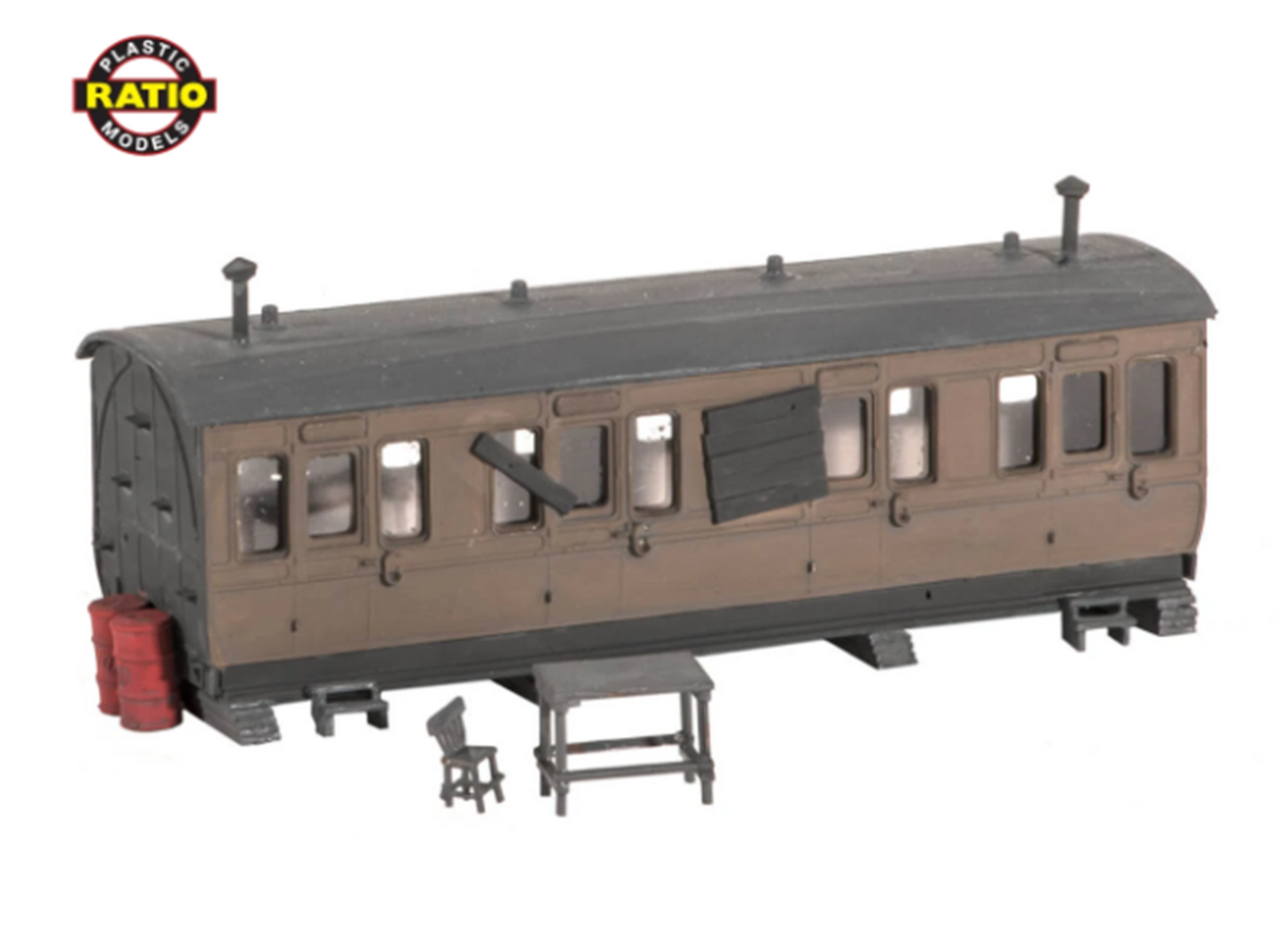 The use of old coach bodies as stores, mess huts or even homes was common. Clutter included, huge scope for adding detail to such a scene. Supplied with pre-coloured parts although painting and/or weathering can add realism; glue is required to complete this model. Footprint 115mm x 40mm