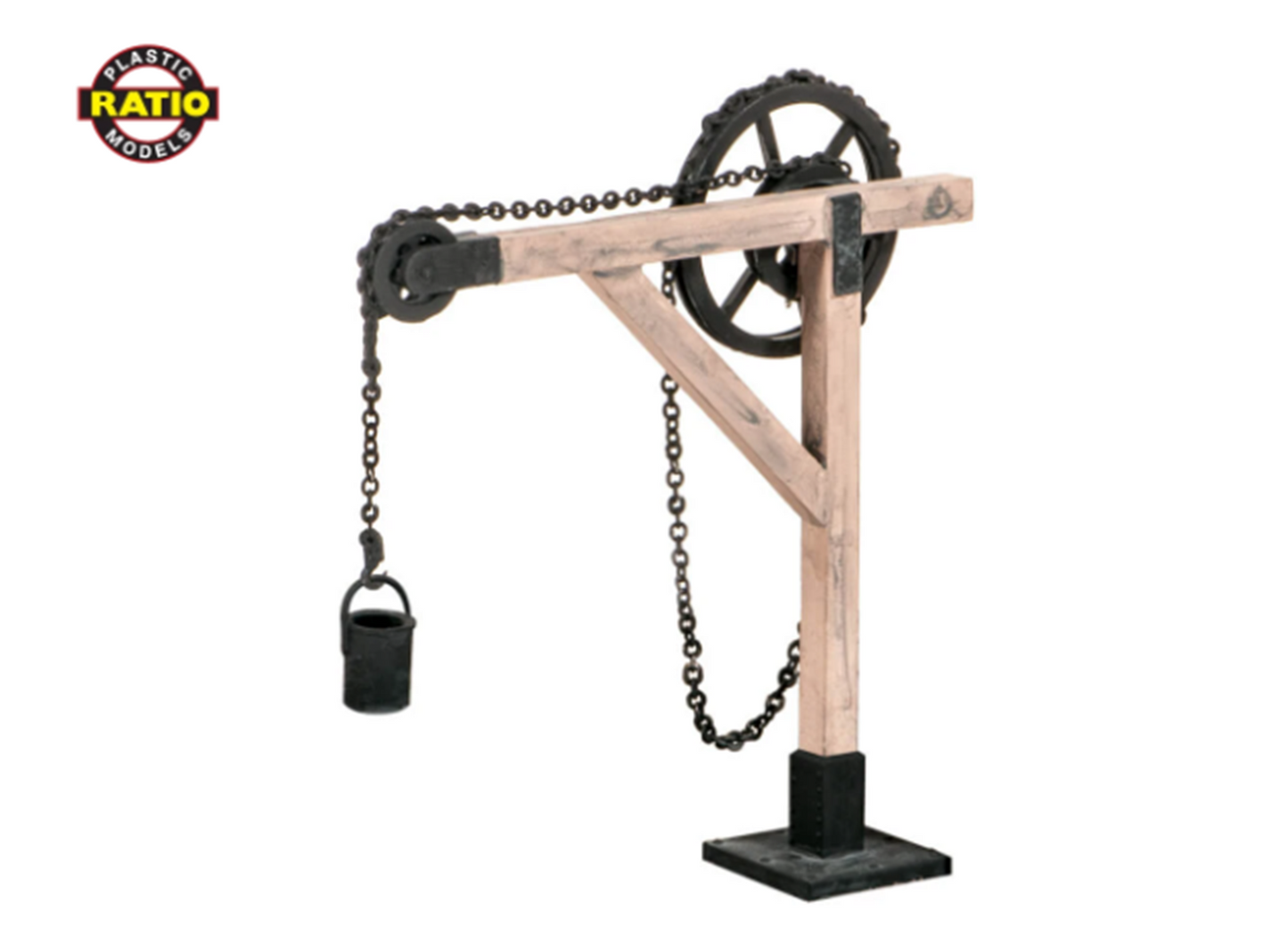 Used for light lifting work in goods depots and other yards. Also to be found inside goods sheds for unloading wagons. Chain included; kit requires glue and paints to complete.