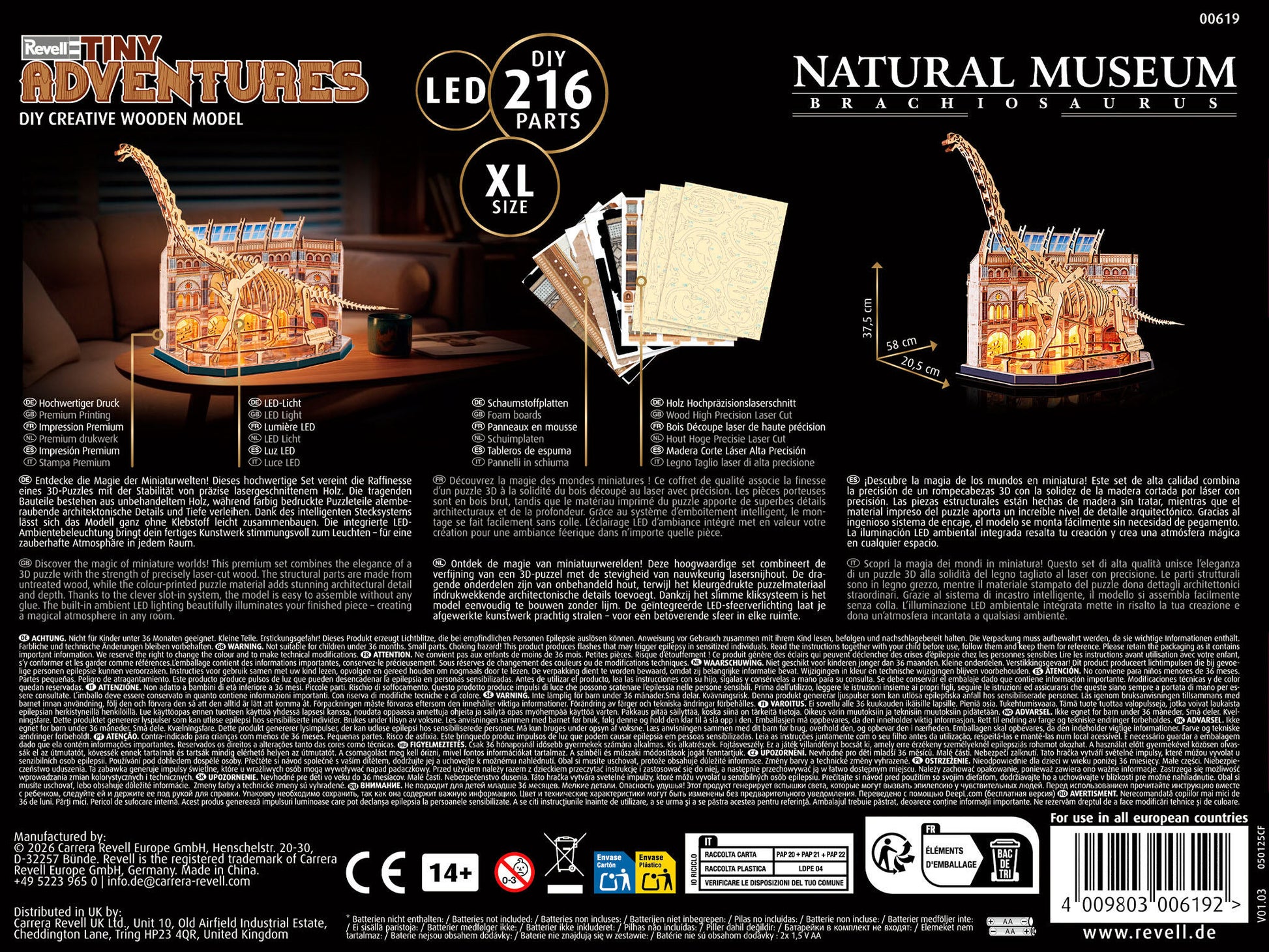 Discover the fascination of prehistoric times with our unique 3D wooden puzzle! This detailed model with 216 pieces combines architectural charm with an impressive dinosaur skeleton - a true eye- catcher for puzzle and dino fans alike. Perfect as decoration, a gift, or a fun project for the whole family! With LED!